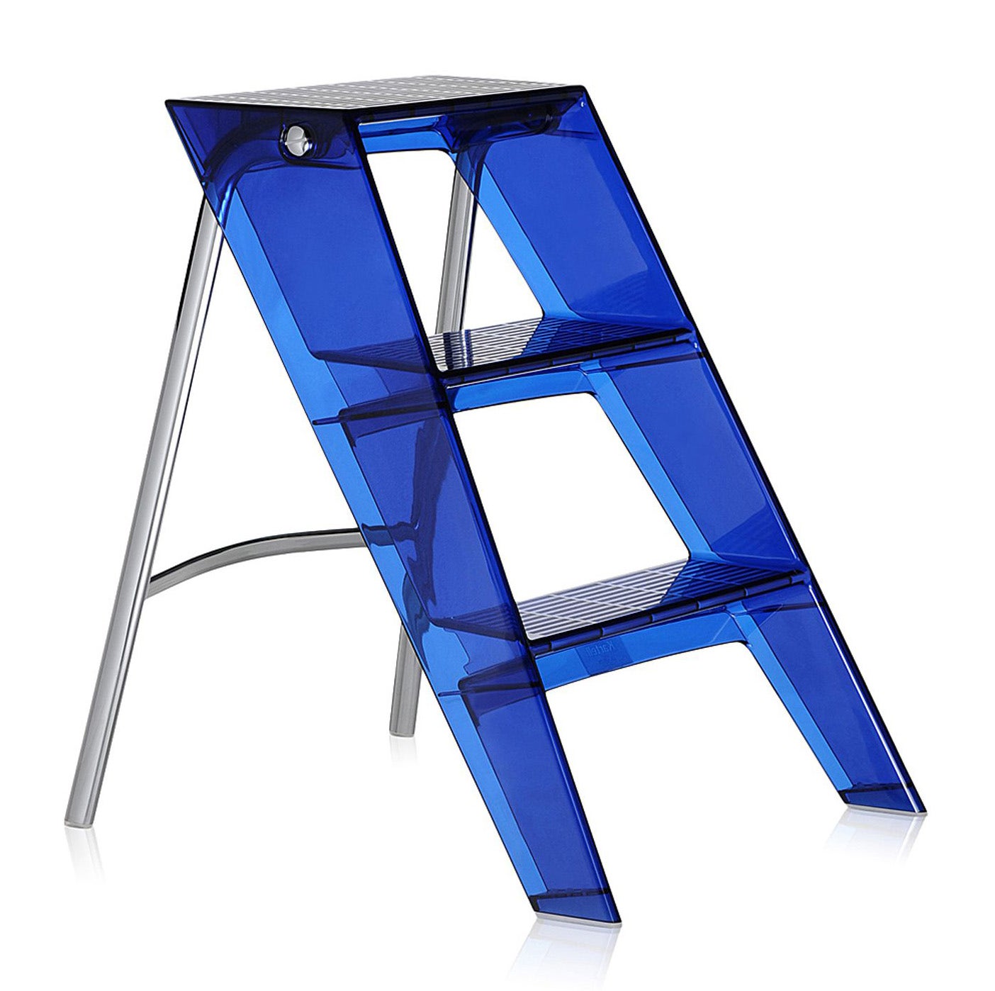 This stepladder has a strong personality and great functionality. It is also a successful marriage of form and function. Its pragmatism is made possible by the technology employed by Kartell and has permitted the shaping of polycarbonate, giving it the durability, strength and toughness which a stepladder requires. The metal structure is solid and welded to a polished and crystalline body in transparent polycarbonate. The slip-resistant steps are practical and safe. An item which, aside from being multi-functional and practical, is also attractive and can even be used for decoration.