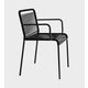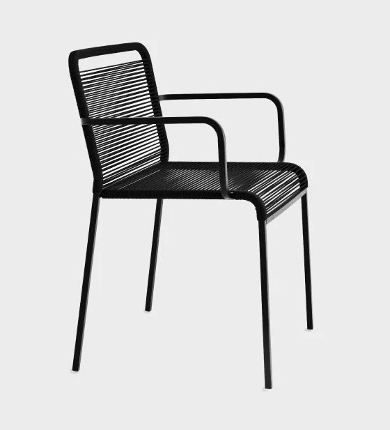 Stackable armchair in stainless steel AISI 316L sandblasted or polyester powder coated white or black. Seat and back are handmade with cord in double polyester twisted thread with a cotton finishing. Glides in polythene.