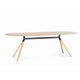 Table with base composed of aluminum drawn tube with elliptical section and connection in die-cast aluminum powder coated. Legs veneered in wood or powder coated with adjustable feet in nylon.