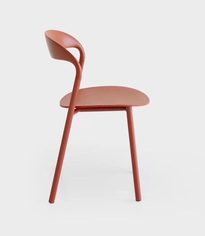 Stackable chair with powder-coated steel frame and polypropylene backrest and seat in various colours. Nylon feet with integrated felt.