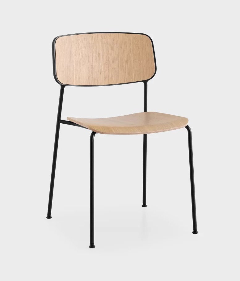 Stackable chair with 4 legs in powder coated steel. Seat and backrest in plywood in several finishes or upholstered in fabric. The backrest has a diecast aluminum frame powder coated. Feet in nylon with felt.