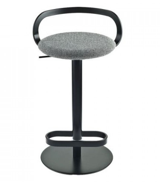 Stool with metal frame powder coated and height adjustable swivel seat in MDF upholstered with fire retardant polyurethane moulded foam and covered with fabric, soft leather or eco-leather. Felt under the base.