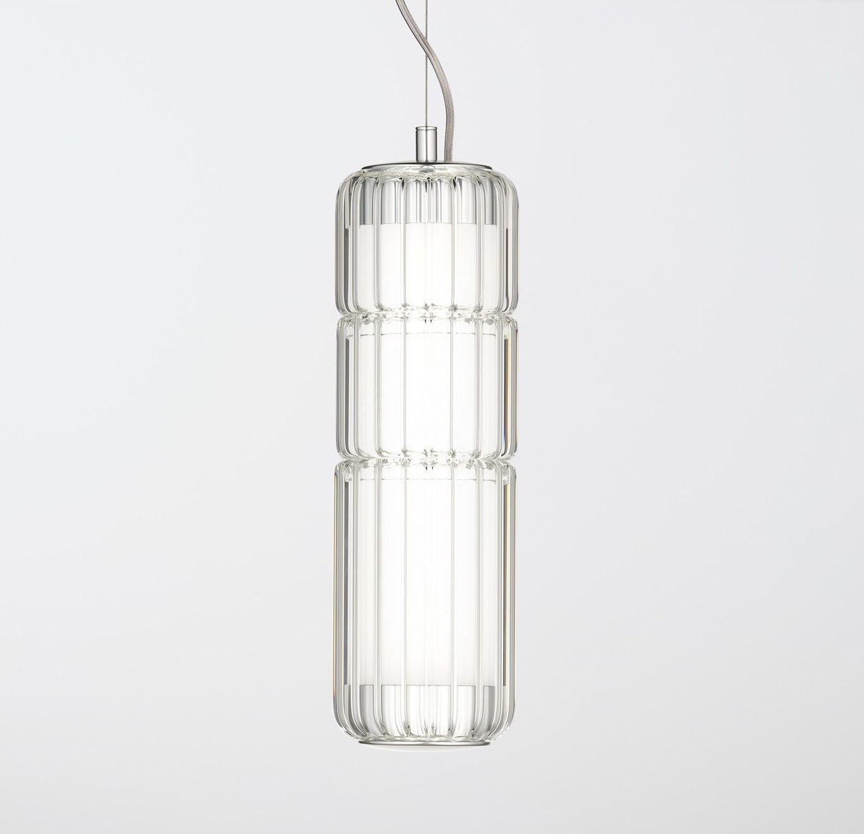 Designed by Rockwell Group, the Stacking Collection merge cutting-edge technology and traditional glassmaking techniques. It includes three sets of floor lamps and a series of horizontal and vertical pendant lights. The floor version was conceived in 2007 and pays homage to the rich Venetian glassmaking tradition employing the “incamiciato” technique (Italian for “jacketed” or “layered”), which requires skilled glassblowers layer multiple glasses during the blowing process. This labor-intensive technique builds up different colors and opacities in each module. When these cylinder modules are combined and overlaps, a captivating mixture of colors cast a sophisticated ambient light. Sixteen years later, the suspended lamps are added to the collection. Stacking S is composed of a cylindrical diffuser powered by 5 high-quality LED strips. The decorative elements are made out of blown borosilicate glass. Machined aluminum end-caps keep everything together and act as suspension anchoring points. The "Naked" version without decorative glass is also available. With three different sizes for vertical versions and two for horizontal version, the suspended range can work in clusters and create beautiful and fascinating shapes of lights.