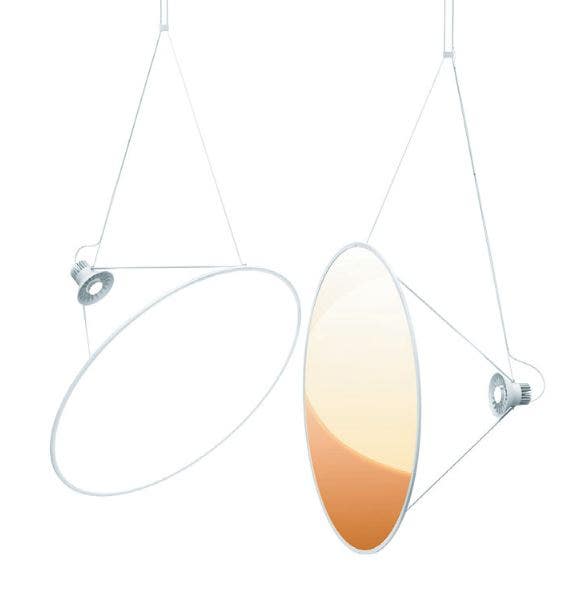 The Amisol project is about making a pendant light that occupies a large physical space with a minimal physical volume, for easy orientation in space. A translucent white fi lm or a metallized mirror membrane is stretched inside a circular aluminum profile. Like a solar sail, an incredibly powerful light source projects a beam of light onto the large, almost weightless disk, either diffusing or reflecting the light. Thin rods connect the two main elements together. By altering the length and the connecting points of the two supporting wires the rotation of the disk can be set in any angle.