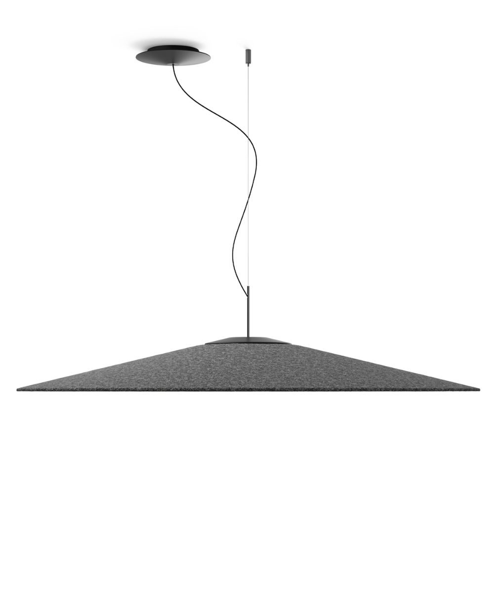 Along with the high-tech lighting engineering performance which distinguishes it, Koinè enjoys yet another innovative element in the sound-absorbing version. The reflector is a felt cap (60% recycled) which not only has an important decorative role, but also allows increased acoustic comfort in the vicinity by reducing the time of sound reverberation. An aluminum portion inside covers the surfaces and contributes on one hand to holding the felt in place, and on the other hand to dispersing the heat of the light source.
