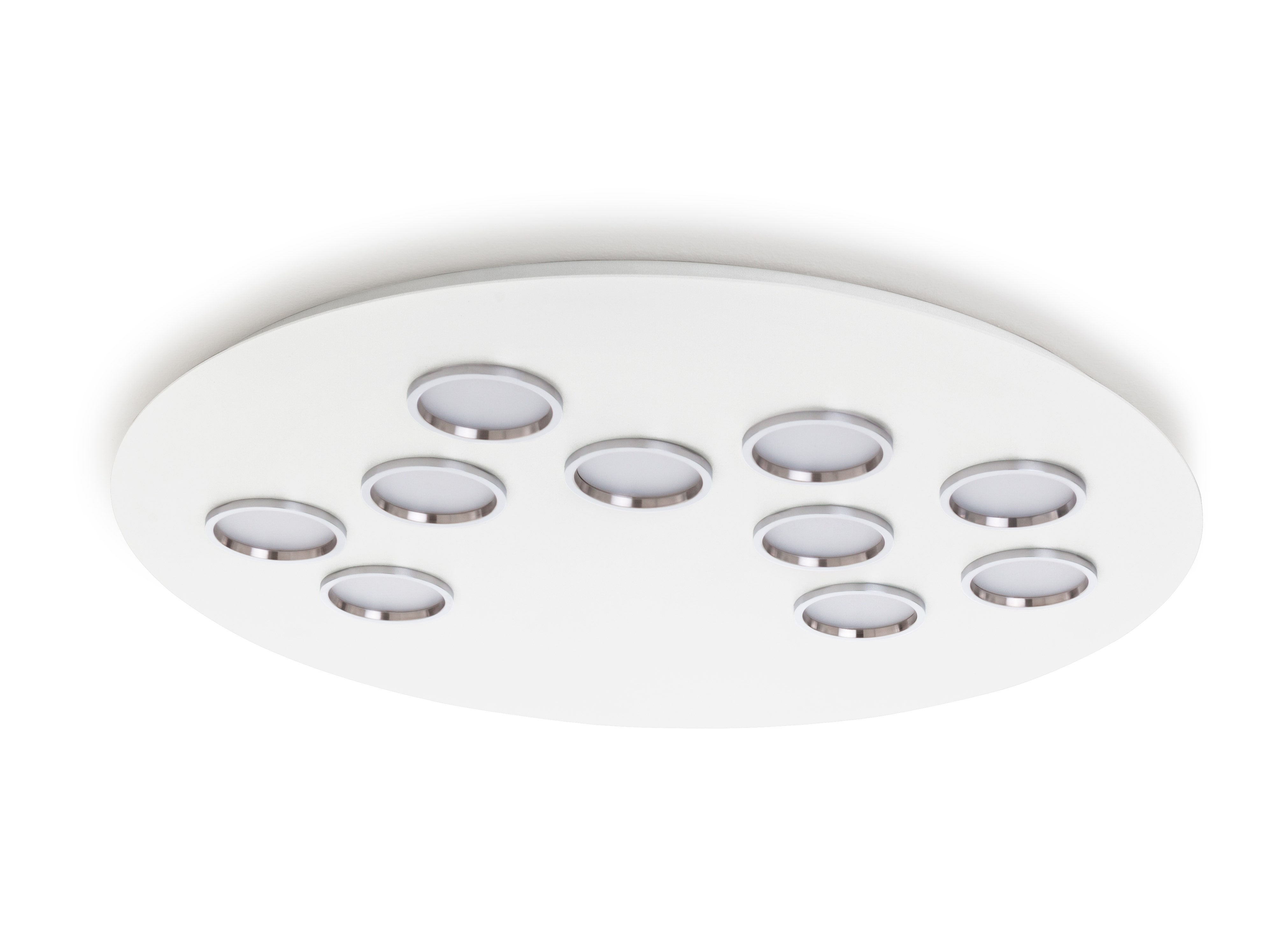 The ceiling lamps BRAC, in their simplicity and minimalism, draw light circles that remind bright water effects. Drops of light arranged on a round surface. The design purity always offers new suggestions. Several BRAC ceiling lamps create dynamic compositions. Made of metal with white fine textured (FT) finish and chromed rings.