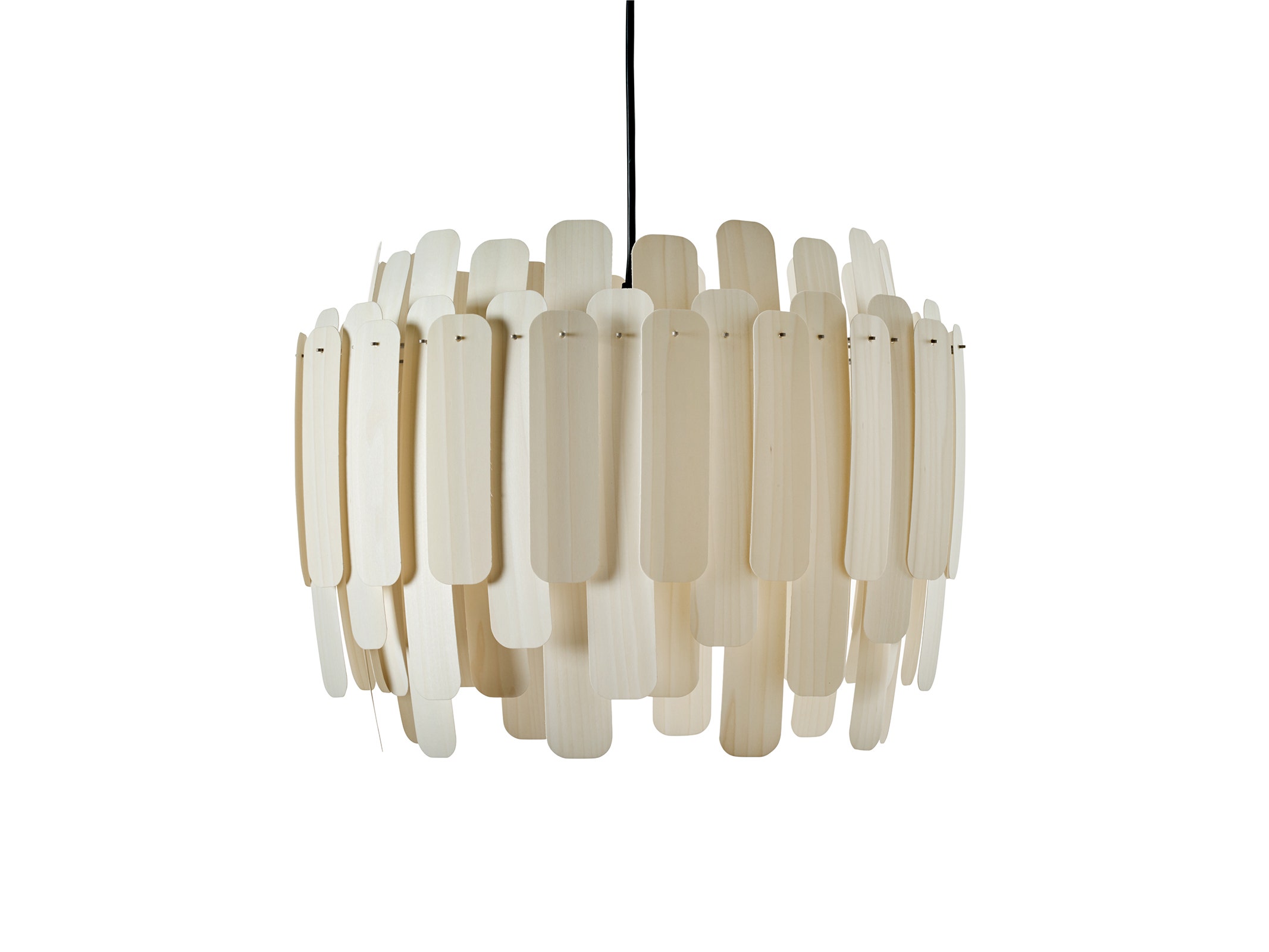 The do-it-yourself Maruja is packaged with all the components needed to assemble the lamp: wood veneer strips (in several sizes), a circular frame, and pins. Maruja is easily constructed, without the need for any tools or adhesives. Using a pin, each wooden strip is clipped onto the circular frame—insert a light bulb, and you will have created an elegant, handmade lamp. The wood veneer strips hang and move freely, and when illuminated, Maruja sparkles with life.