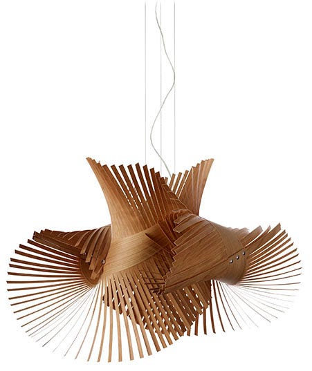 The Mikado light takes its names from the classic pick-up-sticks game, where sticks are bundled together and when released, fall in a circular jumble. A radiant light, Mikado’s wood veneer strips spread outwards, in a manner evocative of a bird’s plumage. Cleverly engineered, the Mikado’s form is both chaotic and harmonious at the same time.