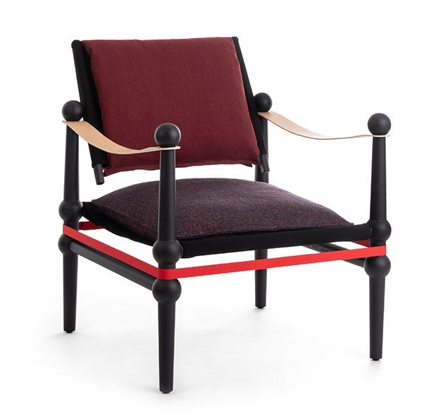 - Version Bordeaux: frame - beech black, seat cushion - enea check 010, back cover - lino froissè 5500/108, belt - red