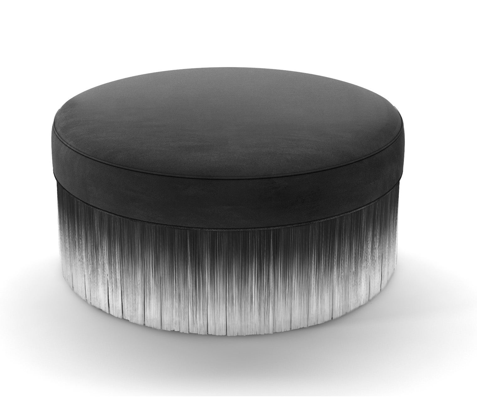 An elegant and comfortable pouf dressed in heart-warming velvet, softly floating on long sensuous fringes that decorate and enhance it, producing a fresh breeze of lightness all around the room.