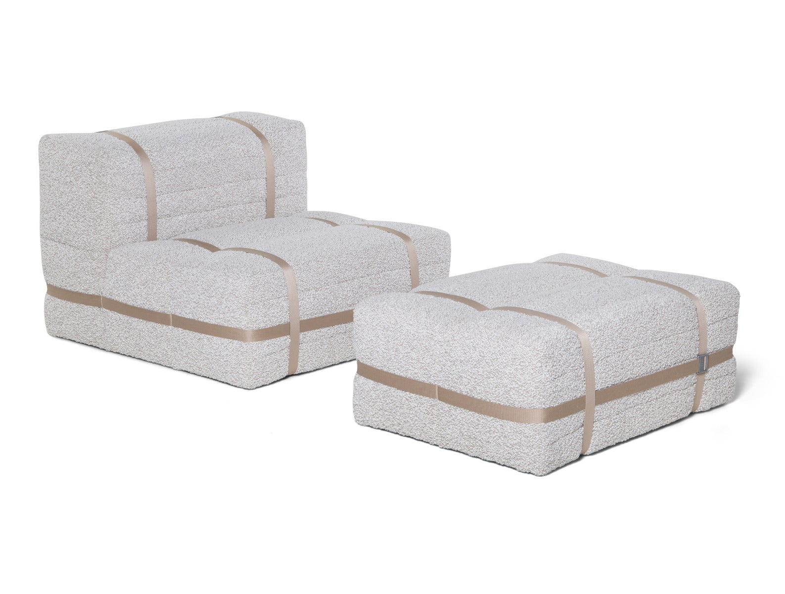 A bold reinterpretation of rural nostalgia, Haybale Lounge Chair with Footstool by Nicholas Baker transforms stacked hay bales into a sculptural statement of comfort. Plush, quilted cushions secured with bold straps recall the practicality of farm life, crafted with meticulous attention to form and function. Complete with a matching Footstool, its modular design invites both play and relaxation.