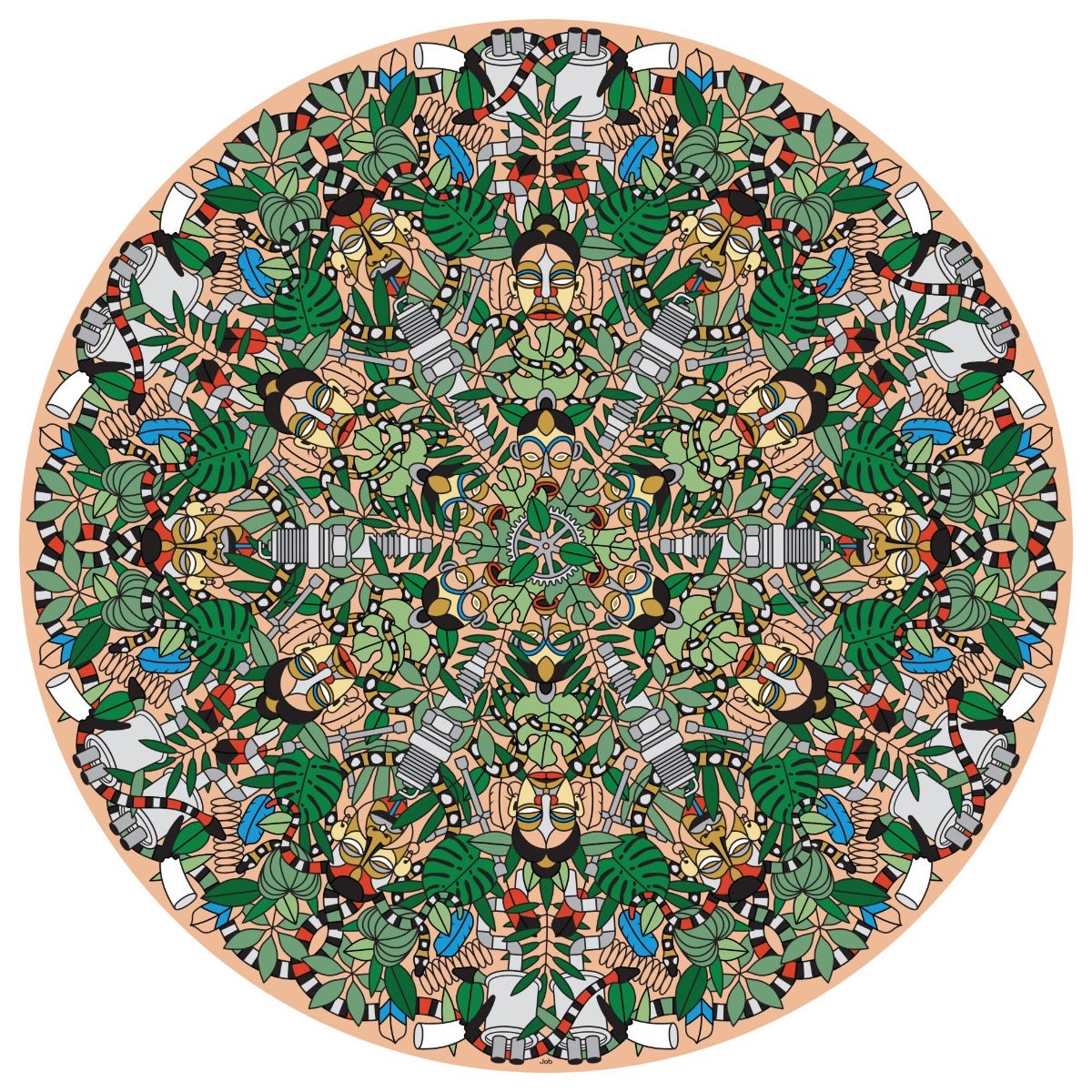 The print of L'Afrique carpet is familiar and mysterious at the same time. Typical elements of traditional African iconography are swallowed into a dense jungle of foliage becoming iconic, yet outspoken symbols of power.