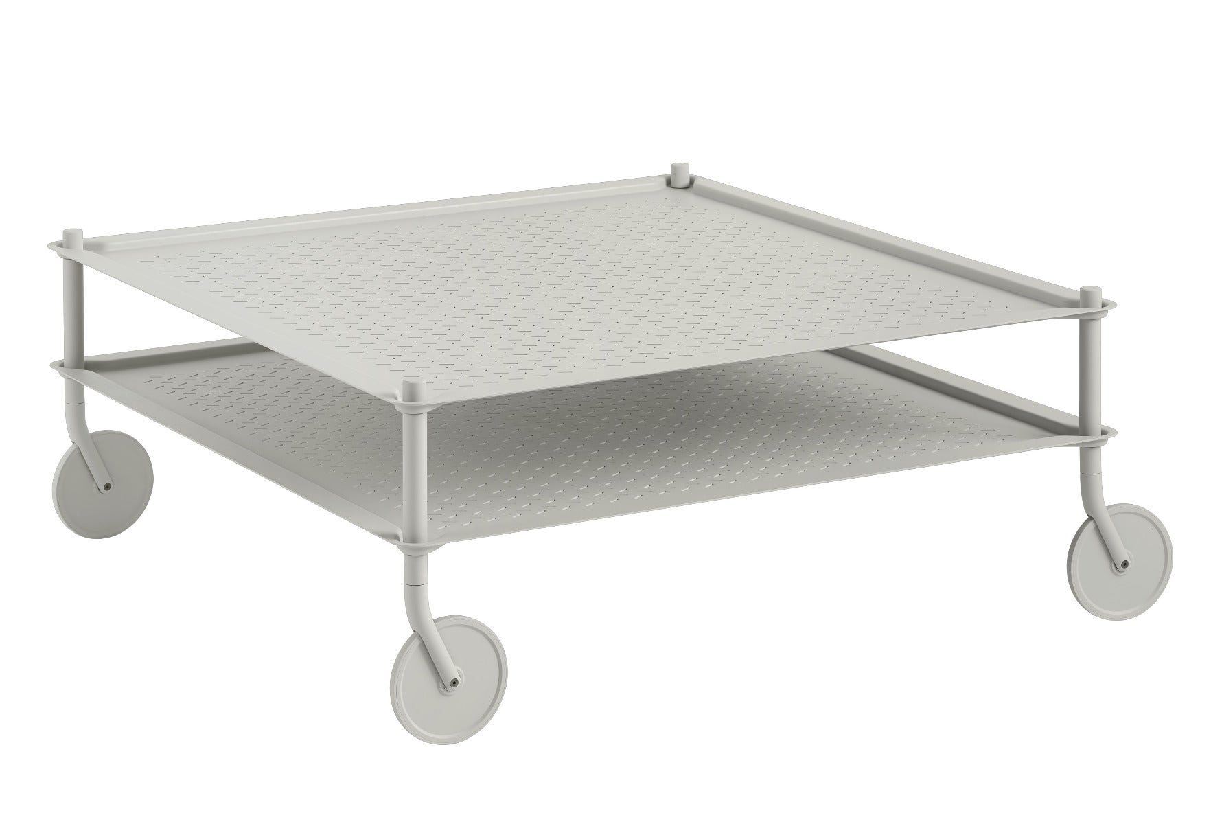 The Flow Coffee Table combines industrial elegance with practical design. Crafted from molded metal sheets, this table features a unique two-layer structure and perforations for a light, airy appearance. Equipped with durable rubber and steel wheels, it moves smoothly and quietly.