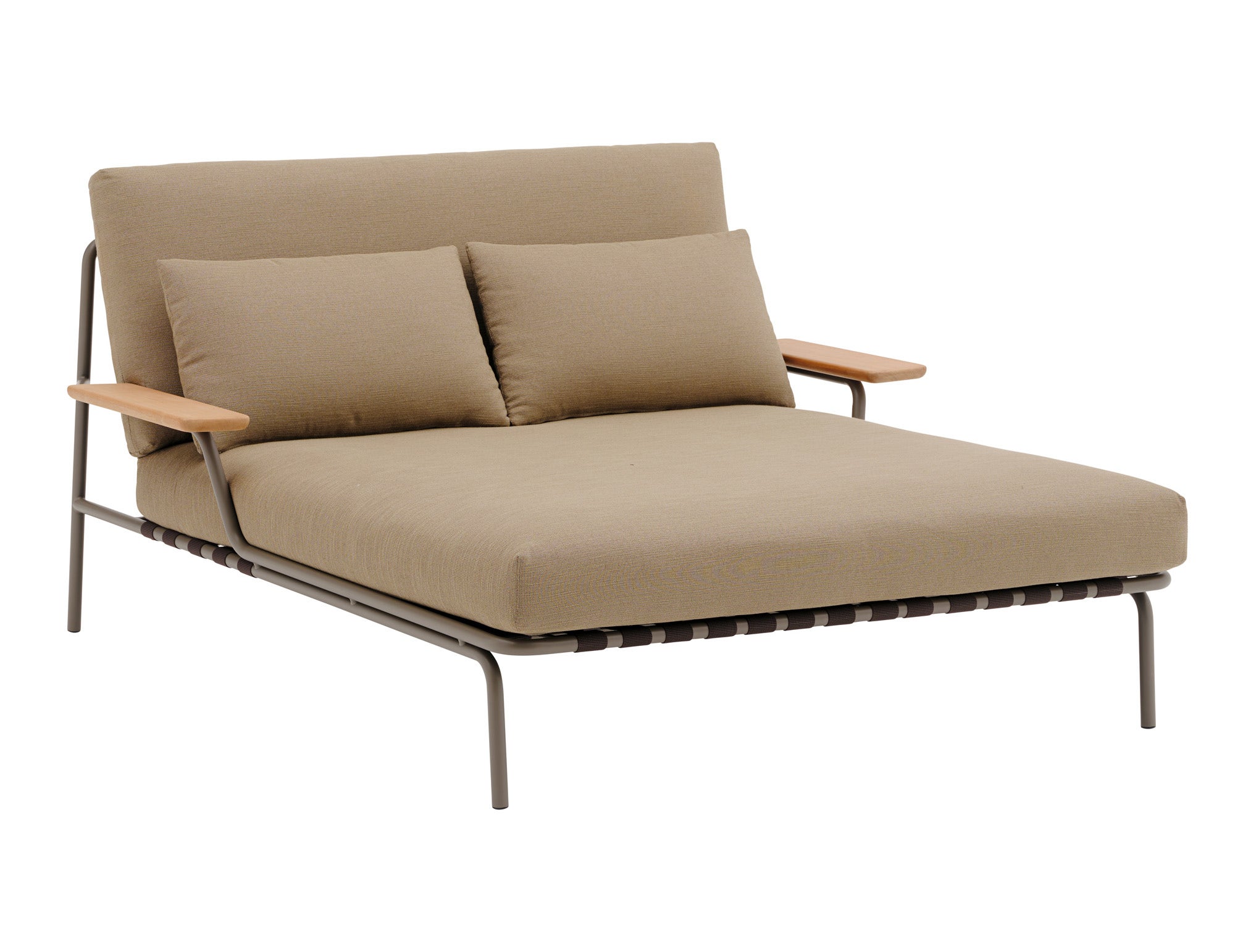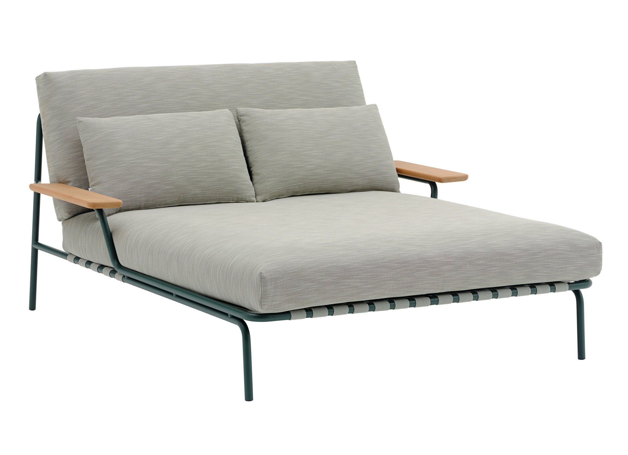 The Settle Lounge Bed w. Armrest invites you to settle into its comfort. With its deep, leaned backrest and extra cushion for added comfort, it's ideal for long, leisurely hours spent unwinding outdoors. Its airy steel frame, complete with visible belts and intricate details, enhances its visual allure from all angles, while its armrests, made from FSC™-certified (FSC-C028824) sapele mahogany wood, add a warm, tactile feel. Settle's steel frame is galvanized, primed, and powder-coated, ensuring corrosion resistance for long-lasting use. The plush cushions, made with quick-dry foam and durable outdoor textiles, offer fast-drying resilience in rain showers and year-round durability when used with an outdoor cover.