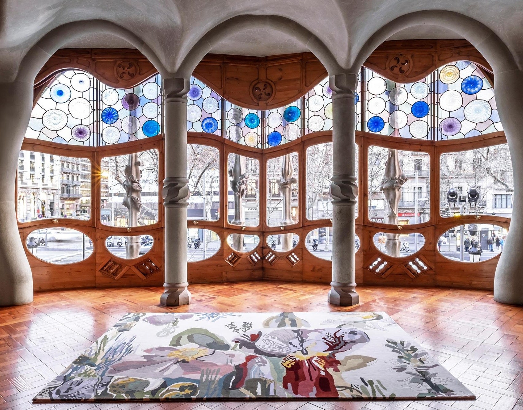 A literal representation of one of Moix’s works, in which the original has been transferred as reliably as possible to a rug. Backyard is a mural that takes a messier approach where flowers are presented on a spectacular scale.