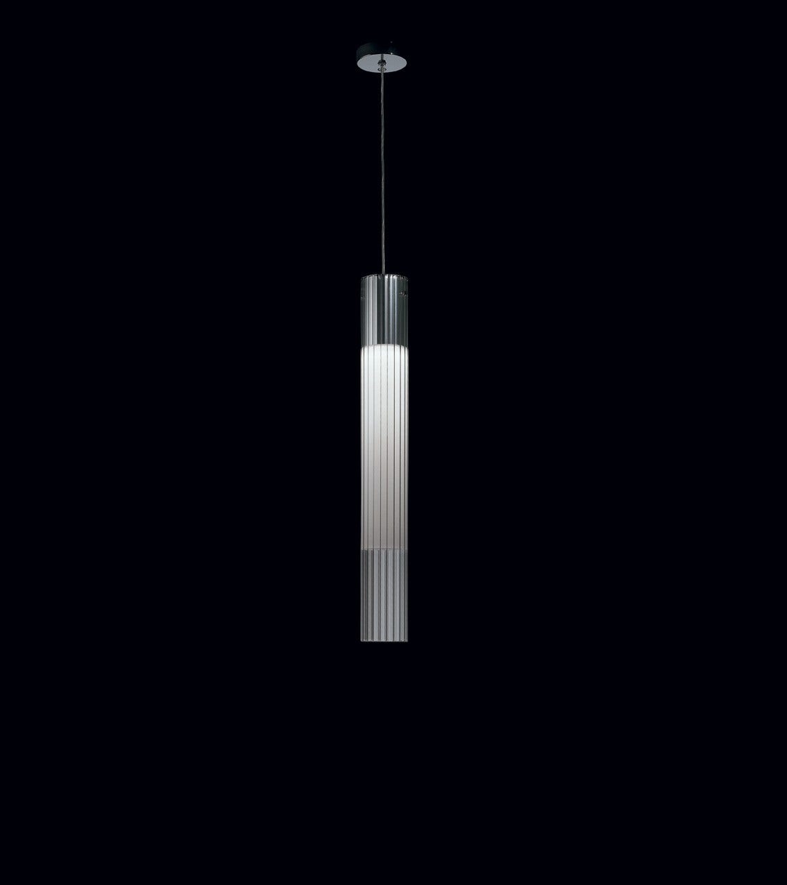 Pendant lamp diffused and dimmable light output. Fluorescent, halogen and LED sources, according to versions. Body with inner diffuser in opal polymeric and outer diffuser in transparent barrel glass.
