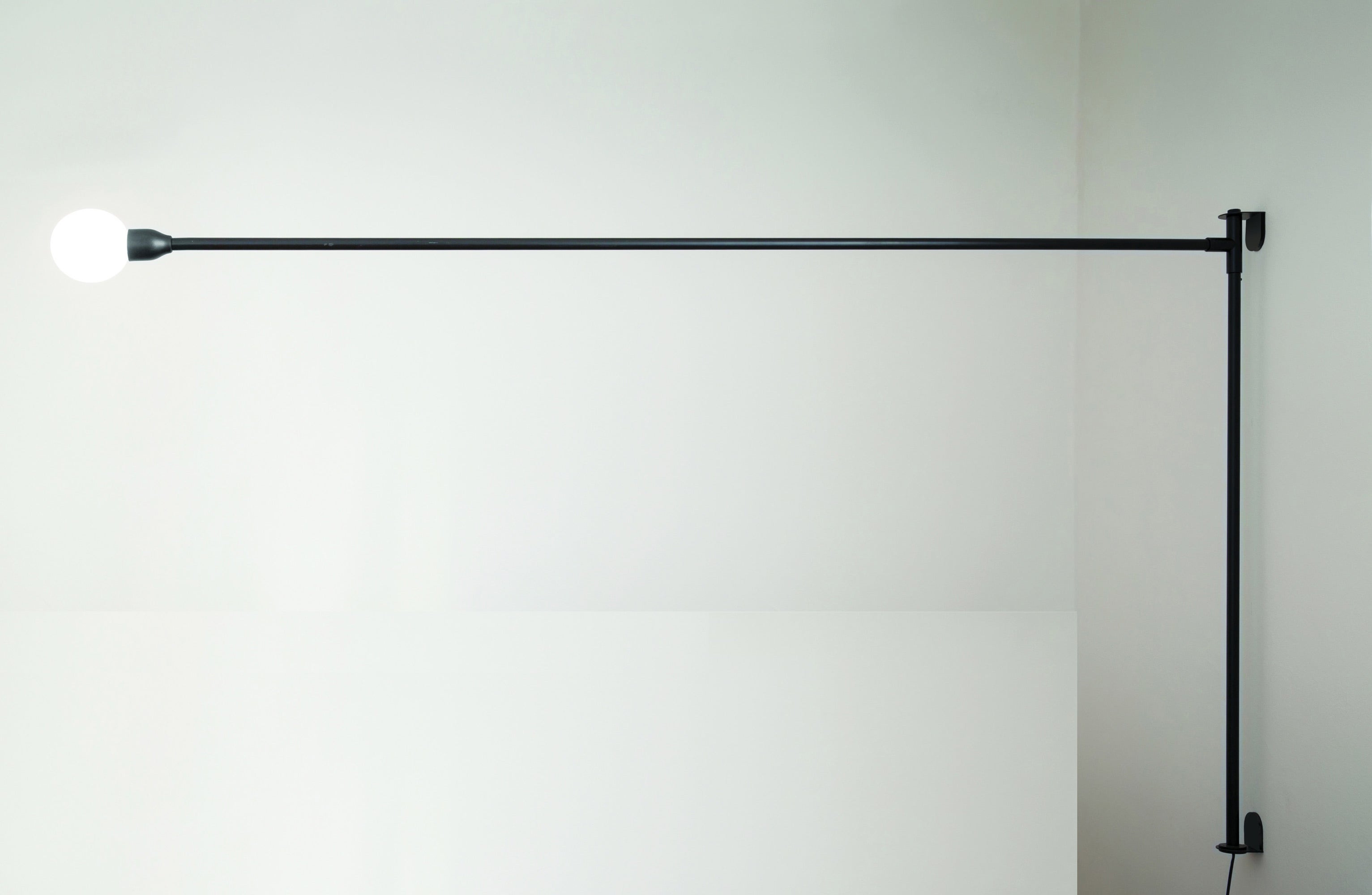 Embossed wall lamp, designed to lighting a room without drilling the ceiling. Arm fixed to the wall and rotating to the horizontal axis, describing a 180° corner. Body in aluminum and metal, painted matt black. Diffuser is a opal glass bubble. Power cable with plug and dimmer.