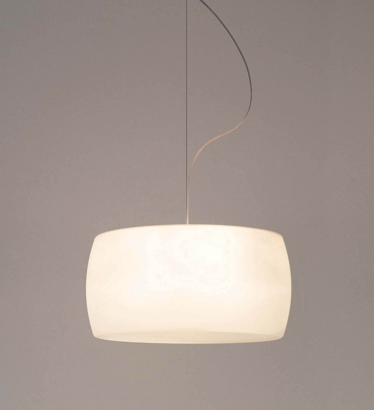 Table and pendant lamp, widespread light. Diffuser in opal white triplex blown glass. Structure in shiny polished die-casted aluminum. Table version with a nickeled steel base. Dimmable.