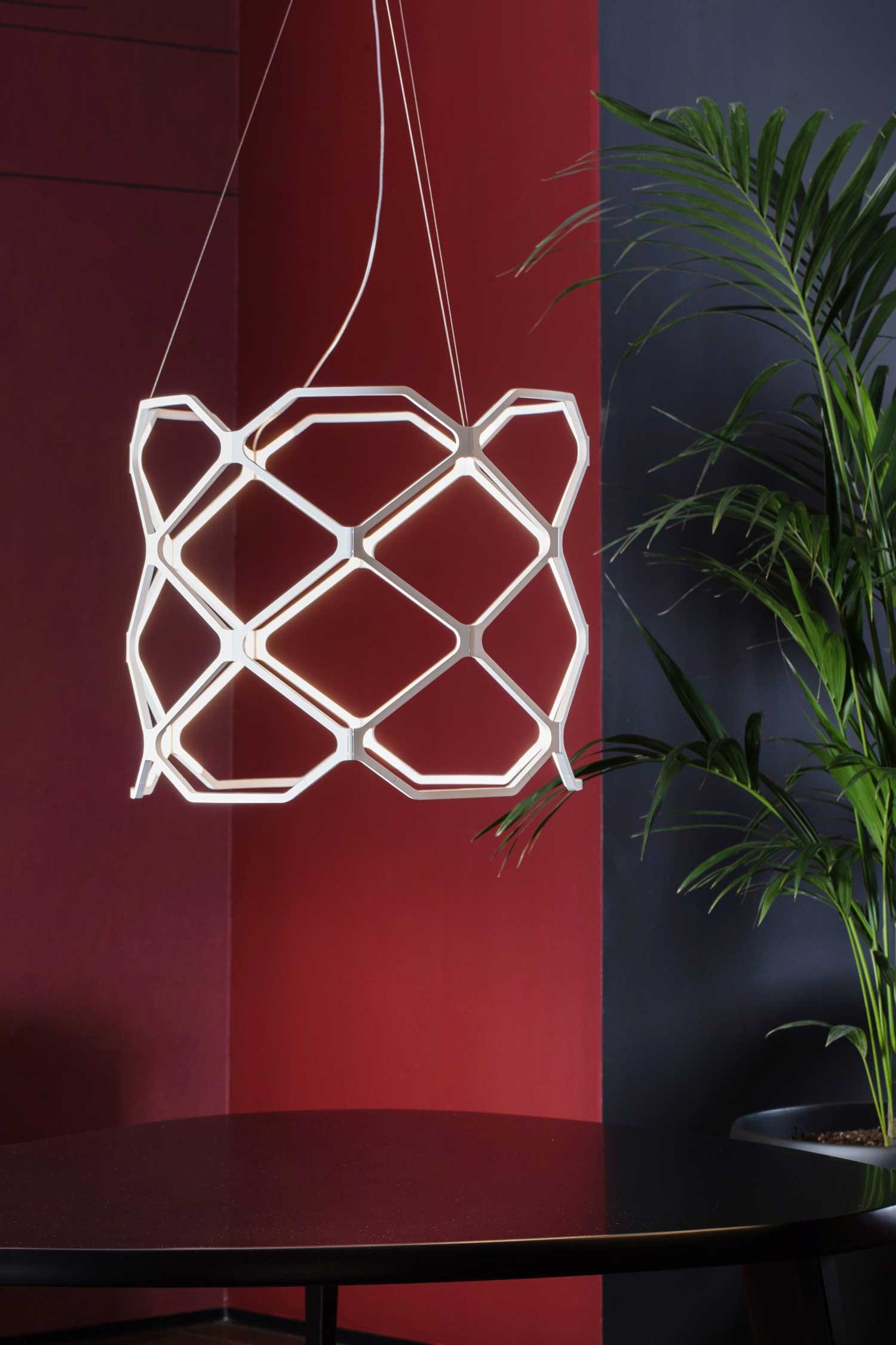 Titia is a suspended swirl of light,‘I had in mind a lamp that would bring together the spirit of Christmas garlands and wooden merry-go-rounds,’ summarises Arihiro Miyake. ‘It’s an old idea that I can at last bring to fruition thanks to the development of LED technology. A cluster of points of light are enclosed within a form that is as light as possible.’ Titia’s aim is to light a table in a diffuse and homogenous manner.