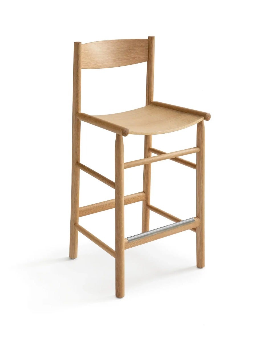 “The intention of the Akademia Bar Chair was to make bar-height seating that is as comfortable as a dining chair. The relatively high backrest and ample seat width ensures that even a full meal can be enjoyed at the bar. As with the Akademia chair, minimal, vertical lines are complemented by the thin curved plywood of the seat and backrest. Available with leather or textile upholstery for additional comfort.” — Kaksikko (Wesley Walters & Salla Luhtasela), 2024