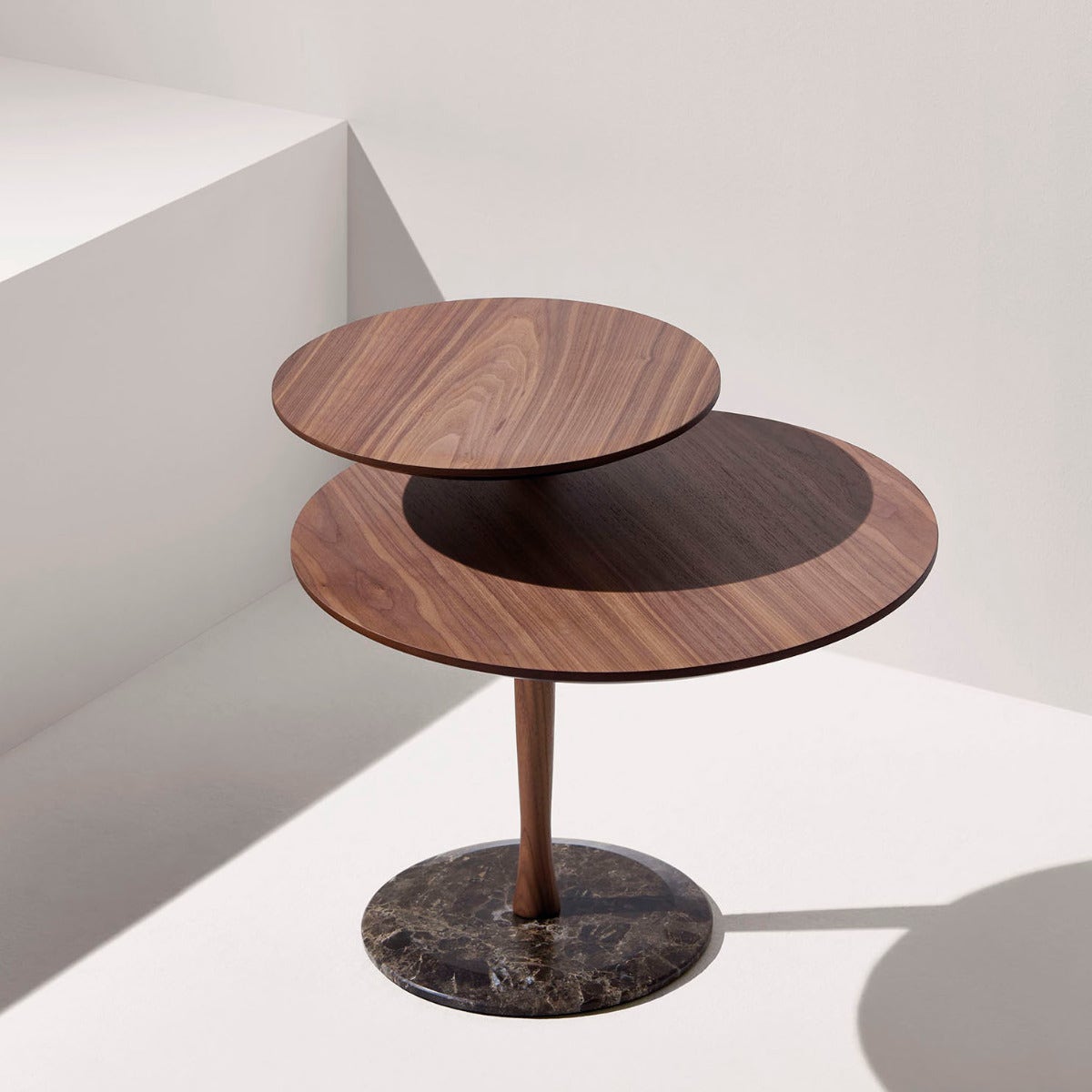 The smooth rotating movement of the two circular tops gives its name to this unique side table. The marble base gives it firmness and sobriety, which contrasts with the modular play of the wood. Its upper top is supported by a subtle piece; a detail that accentuates the exquisiteness of this piece of furniture.