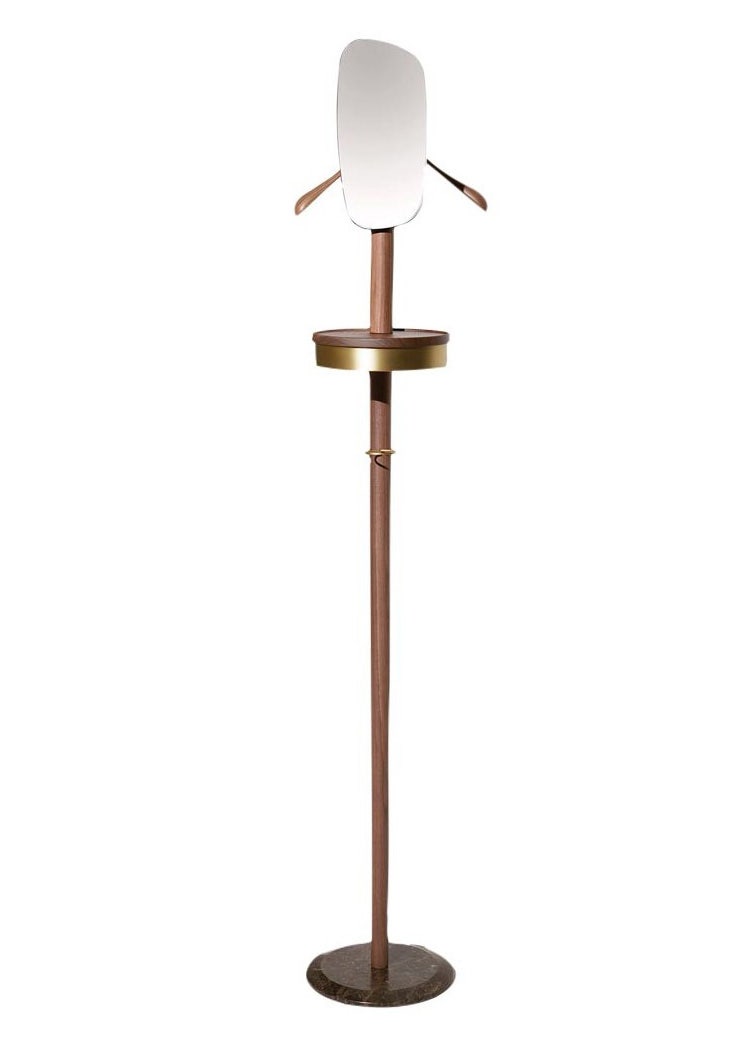 Reinterpretation of the old bedroom furniture, in this case in a feminine way. In addition to the functional hanger to hold the pieces of clothing, it also includes a charming circular jewelry box with sliding opening. The marble base gives it consistency and sophistication. The small central mirror, with its organic shapes, humanizes this elegant piece, perfect for bedrooms and dressing rooms.