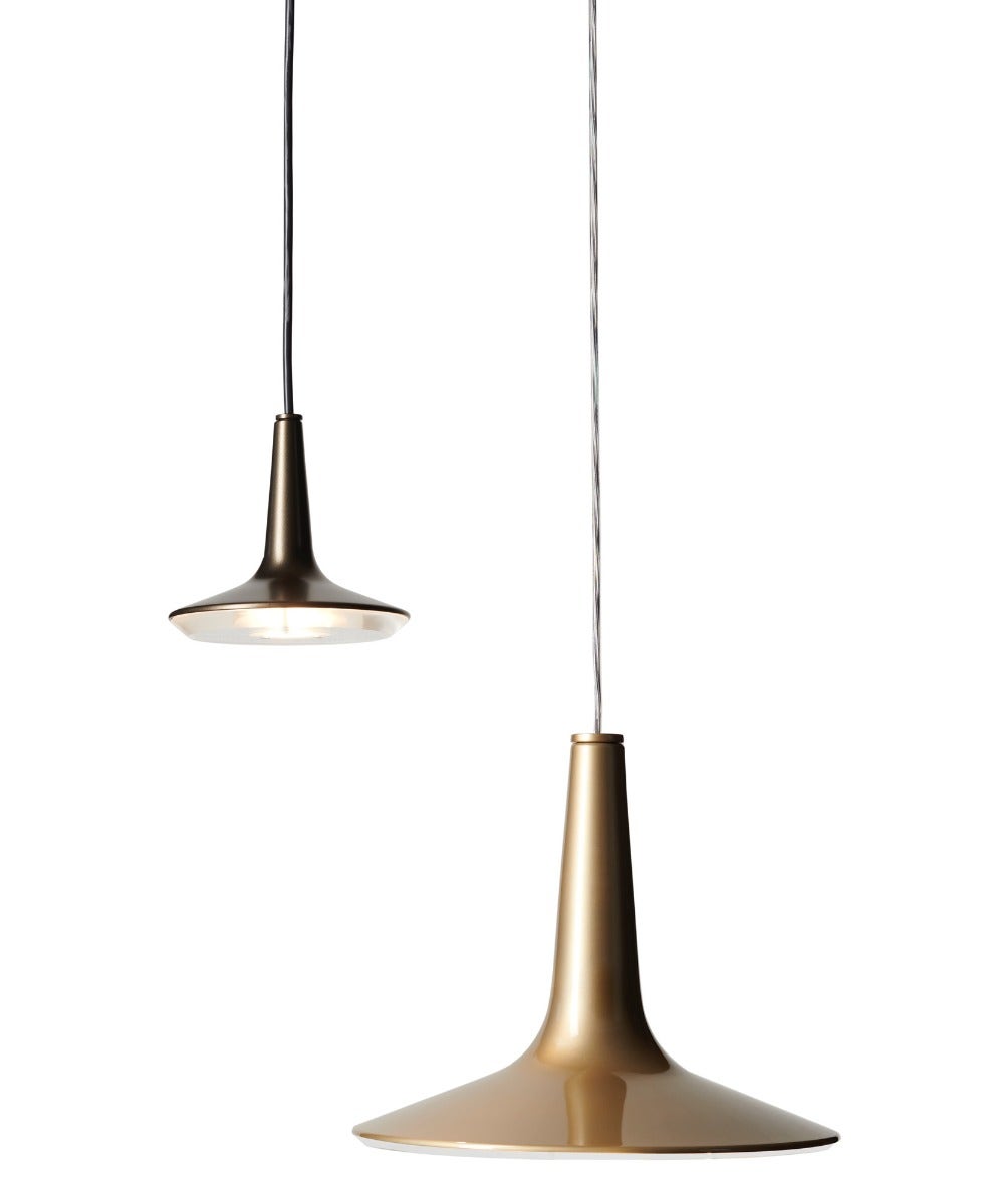 A cast aluminum body with a LED core are the characteristic structural elements of which Kin is made, masterfully combined in Francesco Rota s design of this suspension lamp of an explicit yet refined beauty. The flared shape of the body, with its slim thicknesses, is closed with a methacrylate disc from which its LED light is diffused.