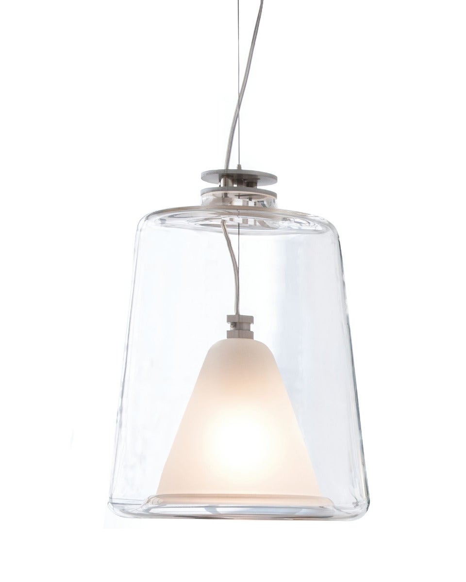 With their two lamps Lanterna and Lanternina, Marta Laudani and Marco Romanelli succeed in enclosing light in a casing made of air. The two different-sized models share the pure shape, composed of two bell-shaped Murano glass diffusers one inside the other: the first, transparent diffuser, hosts the second sand-blasted one, containing the light source.