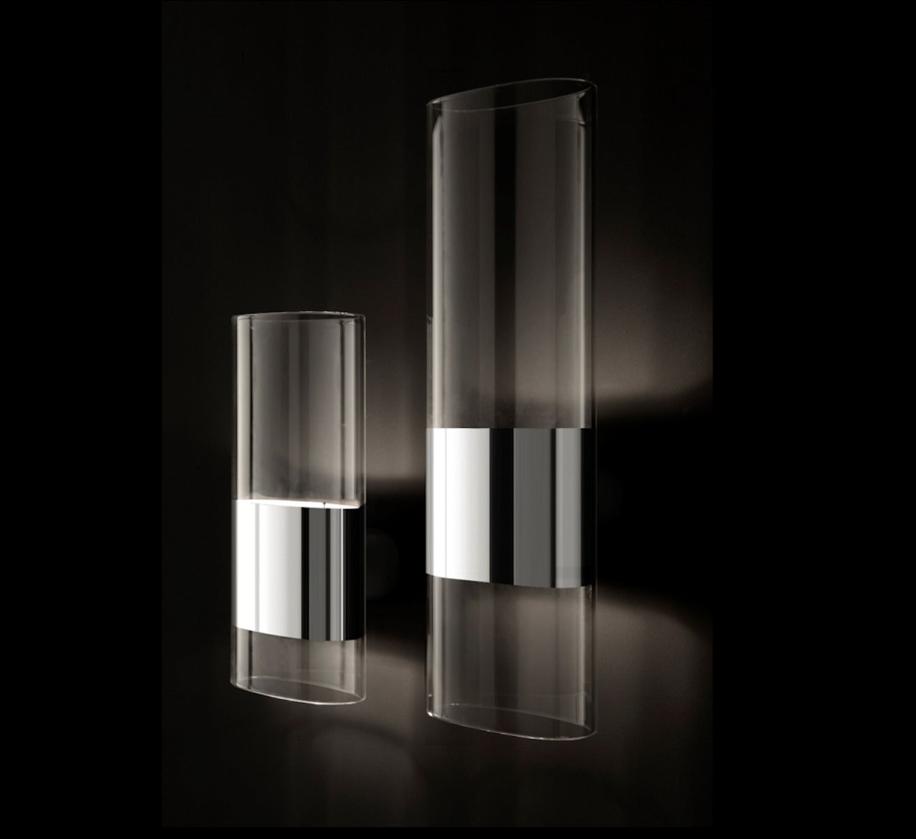 The Line wall lamp uses the special oval Pyrex glass to portray an essential, minimal image, yet at the same time which is strongly characterized. The generous size, the importance of the material, the partial polished aluminum coating, the existence of two light sources that diffuse the light both upwards and downwards, make Line a versatile product.
