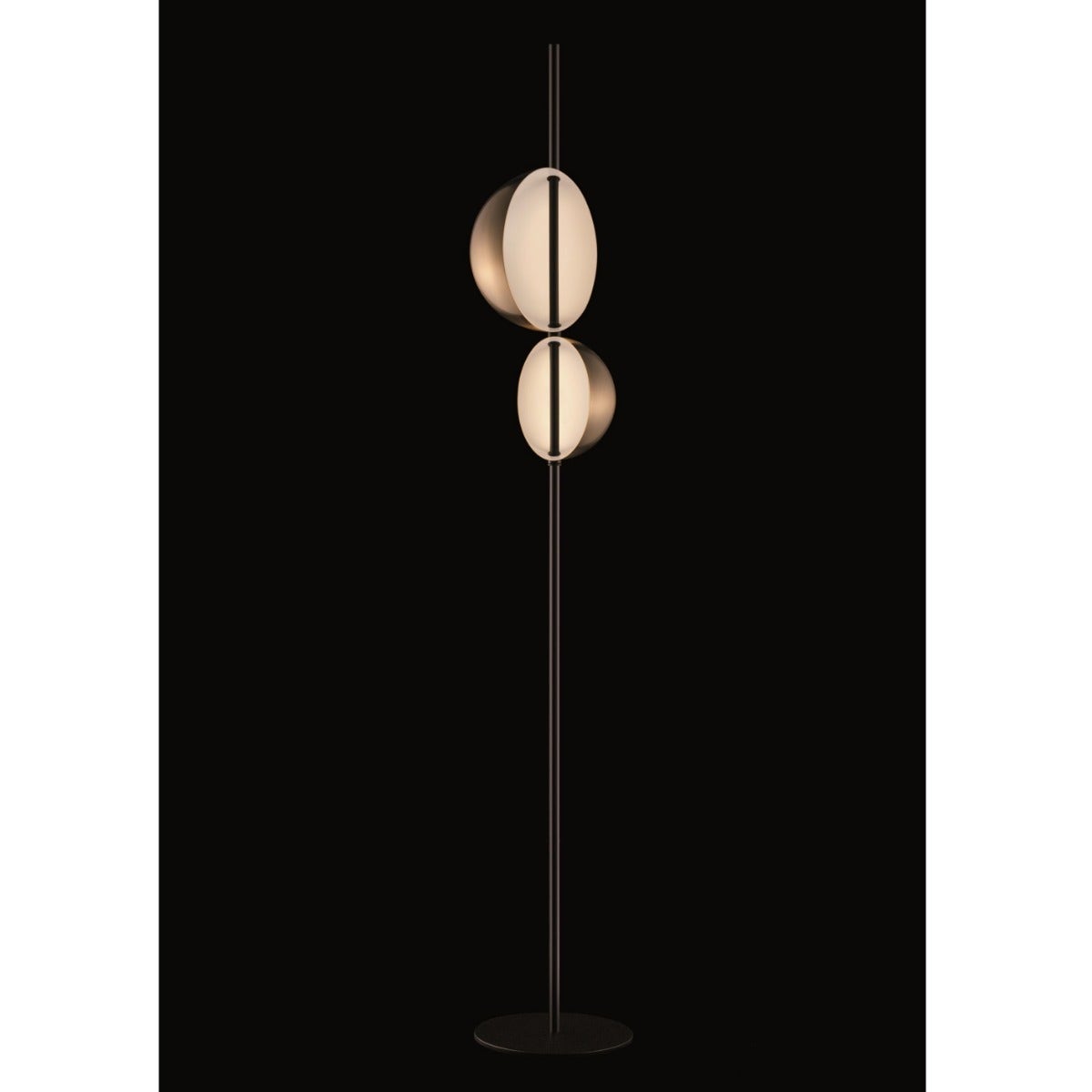 Superluna floor lamp conceals the electrical components and it hosts the light source: the LED opens out onto the stem in line with the semi-spherical shade that reflects its light by rotating on its own axis. In this way, the echo of the perpetual movement of celestial bodies is enhanced by the small luminous core contained in the structure of the lamp itself.