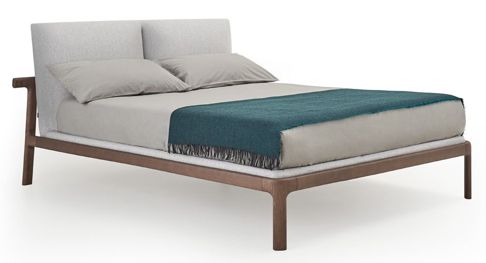 The proportion between the thickness of the frame and length of the elements is fine-tuned and balanced to perfection with the curvature of the corners. The rear part, which supports the upholstered headboard, is reminiscent of a temple frame and runs along an inclined axis, which emphasizes the profile and beauty of the piece, making FUSHIMI particularly suitable as a standalone bed positioned at will away from the wall.