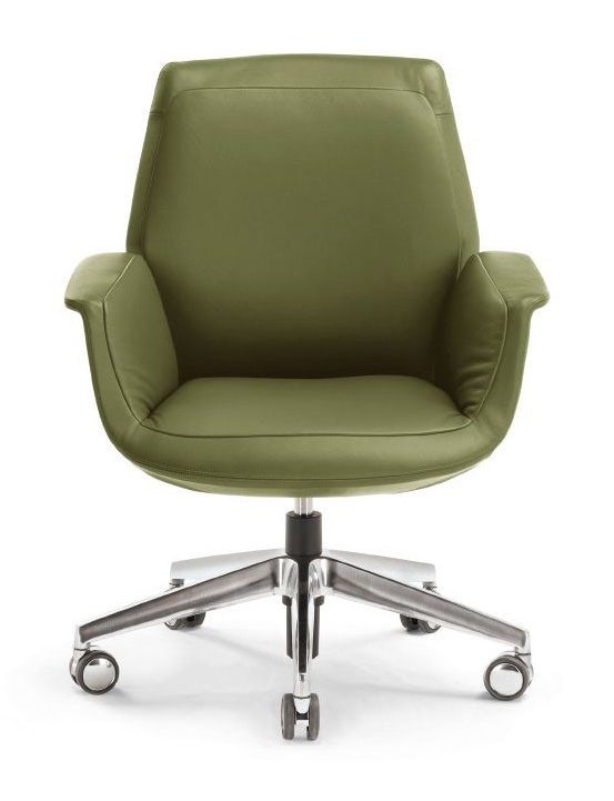 The swivel base is a five spoke, fixed-height base with soft, braking casters. Pelle Frau® Color System leather upholstery that fits like a glove, a sculptural silhouette, and tone-on-tone stitching are hallmarks of Downtown executive and visitor chairs. The back is inspired by an elegant dress. The profile stays slim by hiding the built-in mechanisms. For added comfort, optional micro-perforation for the seat interior allows the chair to breathe.