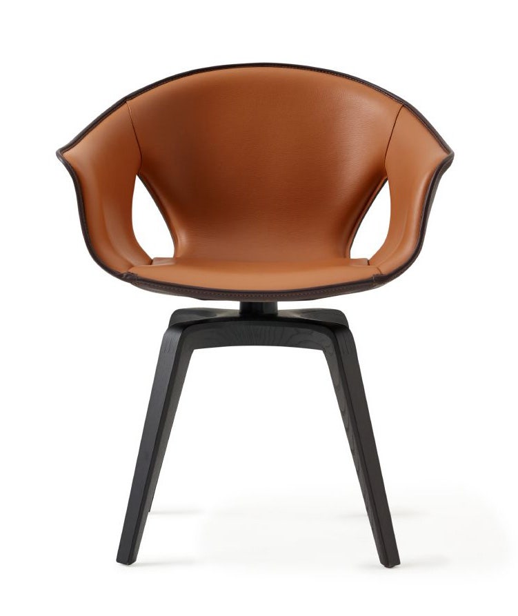 The Ginger chair is distinguished by a single hide of Pelle Frau® Saddle Extra leather cut and folded to form the shell. Decorative topstitching runs along the edge. Pelle Frau® Color System leather on the interior contrasts with the materials and colors of the shell and frame. Ginger pairs naturally with the Fred desk or works on its own in private offices, libraries, cafés, reception areas, and formal meeting rooms.