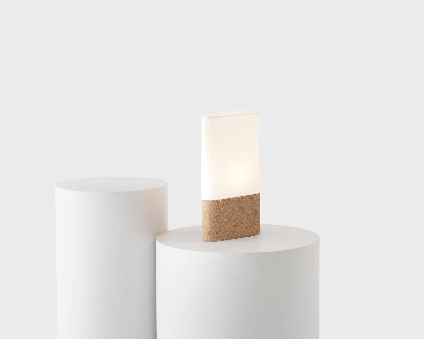 Fulcrum’s shade can be rotated with the gentle sweep of a finger. Raising the light output from a soft glow to full brightness as the shade pivots through a seamless transition of cantilevered rotations, it is composed of a Japanese paper shade and either a sand-cast silicon bronze or cork base.