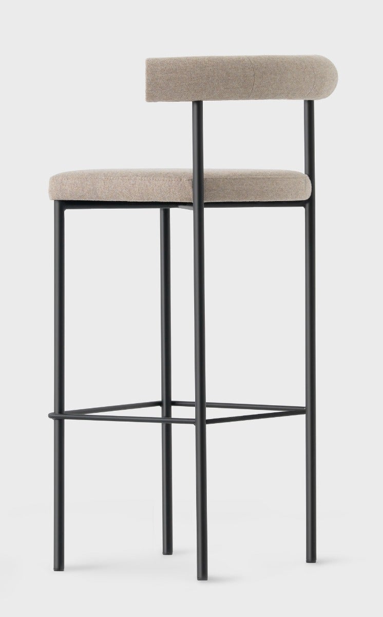 The steel frame of the Kashmir Barstool calls to mind the simplicity of iconic Modernist furniture design, offset by a tailored back-rest, where the circular stitching detail gives the piece a subtle sense of modern craftsmanship.