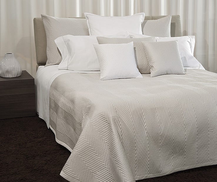 The Letizia light coverlet is made with a very elegant herringbone quilting pattern and is well suited for contemporary environments. The smooth sateen border gives character and refinement to this creation. Made with Egyptian cotton sateen and 80 gr/sqm polyester fill.