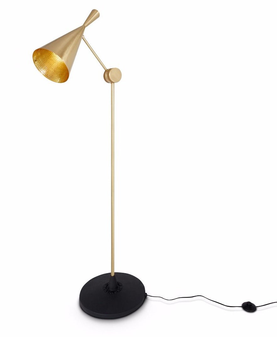 A variation on the famous original Beat Light, this floor standing version on a slender articulated arm can be adjusted to direct the light beam. Solid brass componentry and iron sand cast bases create an iconic footprint for any interior.