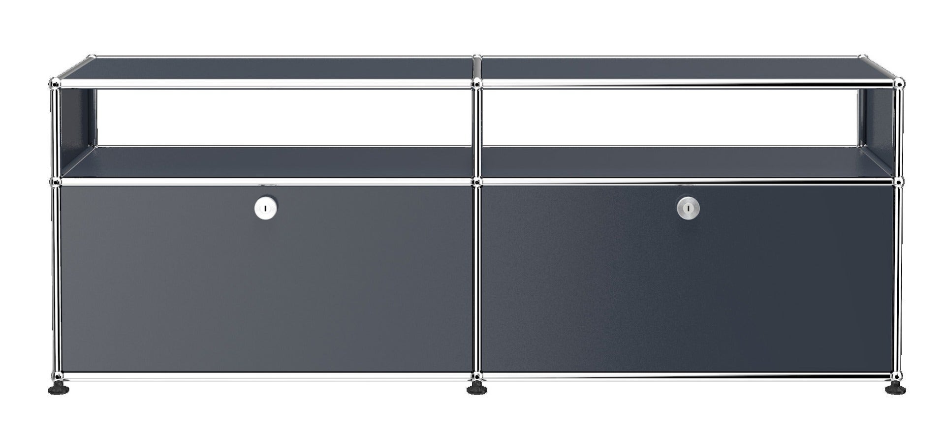 Media storage credenza with two drop down doors that lock with the twist of a coin. One cable cut out is included. DESIGNED BY: Fritz Haller and Paul Schaerer, 1963 MORE INFO