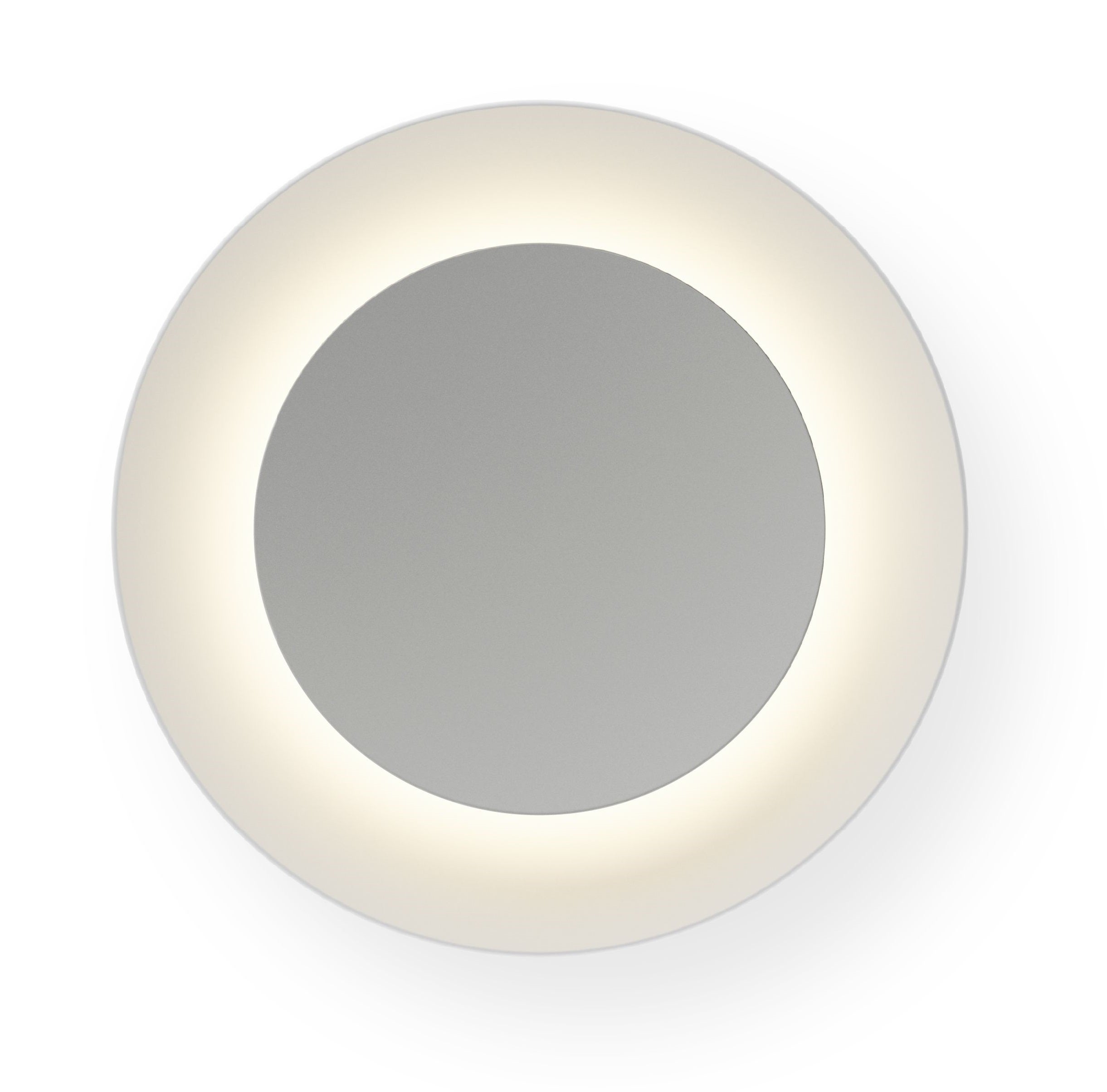 Wall sconce featuring two superimposed discs. Lightly concave in form with different diameters, the larger contains the smaller one physically as well as luminously while diffusing the light emitted.