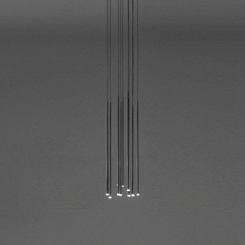 Made in Spain by Vibia. High drama and innovative materials comprise this Slim chandelier. Each of the pendants is a soaring length at nearly four feet with an opening of just 1 inch. The ends are tipped with a frosted diffuser allowing energy efficient LED light to pool below. Details continue up to the chrome canopy it hangs upon. The pendants cord is adjustable on site.