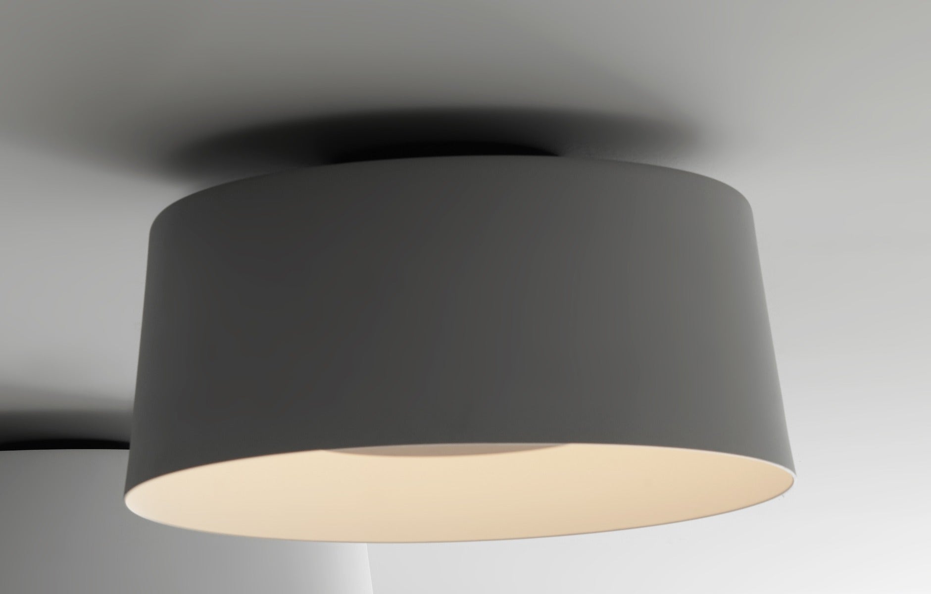 Ceiling lamp defined by its curved sheet aluminum shade lending a visual and material lightweight quality.