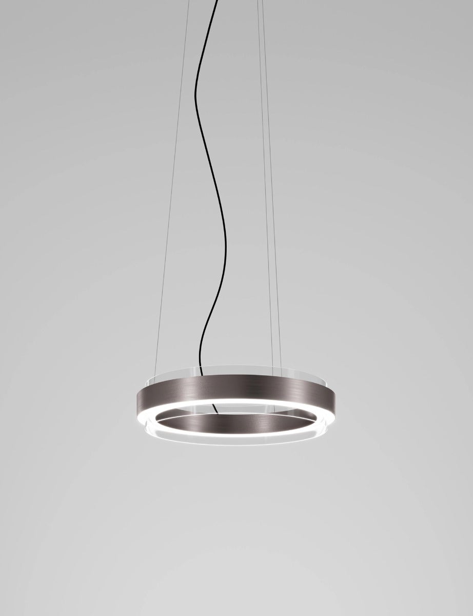 An elegant game of geometries and circular joints with a strong decorative connotation, which embellishes and illuminates the room with a strong but discreet personality. The LED light source is very efficient and completely hidden in the structure. The direct lighting defines the area of light underneath, enhancing the natural beauty of the smoked and crystal tones, which are embellished with matt black nickel and copper finishes.