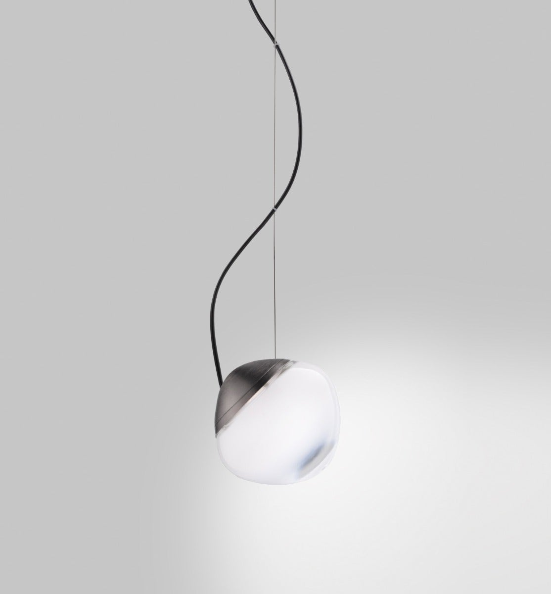 A simple shape reminiscent of a spinning top in motion. A thick glass illuminated by a LED source, filtered by a full bottom to avoid glare. The frame cap is designed to make the lamp adjustable. The small size of the diffuser makes the suspension suitable for cluster compositions where the diffusers can be freely oriented to create ever new configurations.