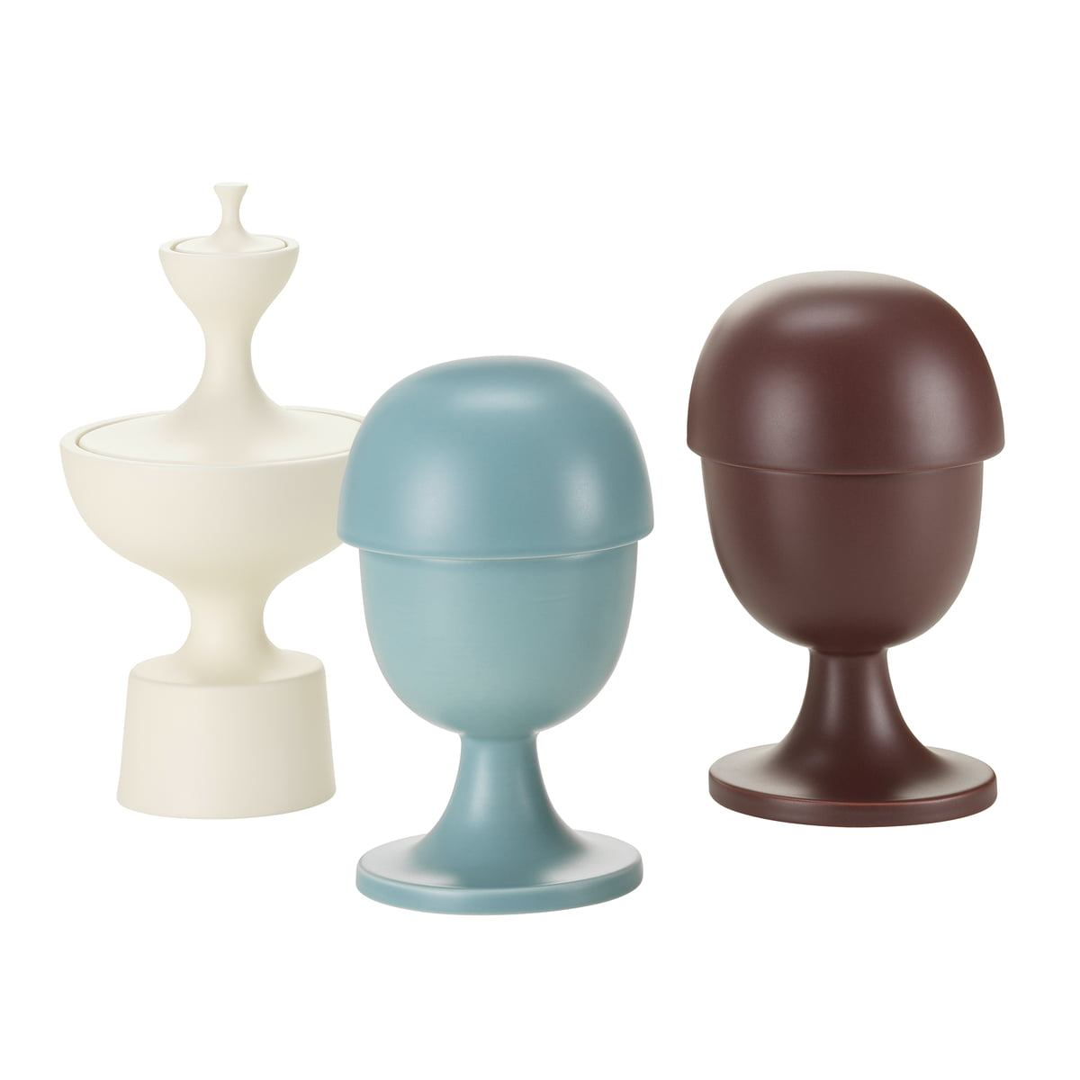 The hand-glazed Ceramic Containers (1952) derive from the original lathe-turned wooden objects by Alexander Girard. Their silhouettes are reminiscent of the traditional shapes of apothecary vessels, board game tokens or millinery blocks.