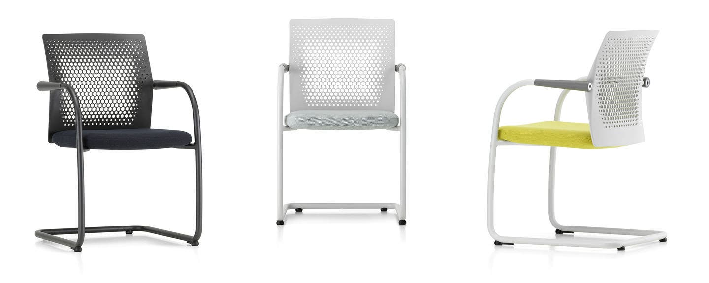 ID Visitor Air has a particularly light and graceful appearance thanks to its slender plastic backrest. The perforated back allows for flexible movement and good air circulation, while offering targeted support. The seat padding is optionally available in a more sustainable PU-free version, and the cantilever base is stackable.