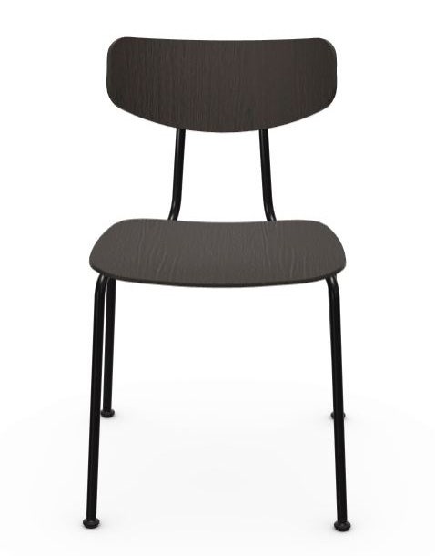 The base of Moca is constructed with two arcs of steel tubing – one forming the front legs and backrest support, the other constituting the back legs. Two veneered plywood shells are mounted on the base elements to create a comfortable, anatomically shaped seat and backrest. The clever design of the stacking protector attached between the seat and backrest provides optimal protection for the veneer surface.