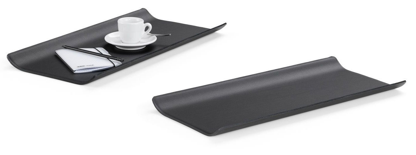 The narrow rectangular Sofa Tray (2017) by Antonio Citterio is made of leather-covered steel and provides a stable storage area on soft, upholstered surfaces.